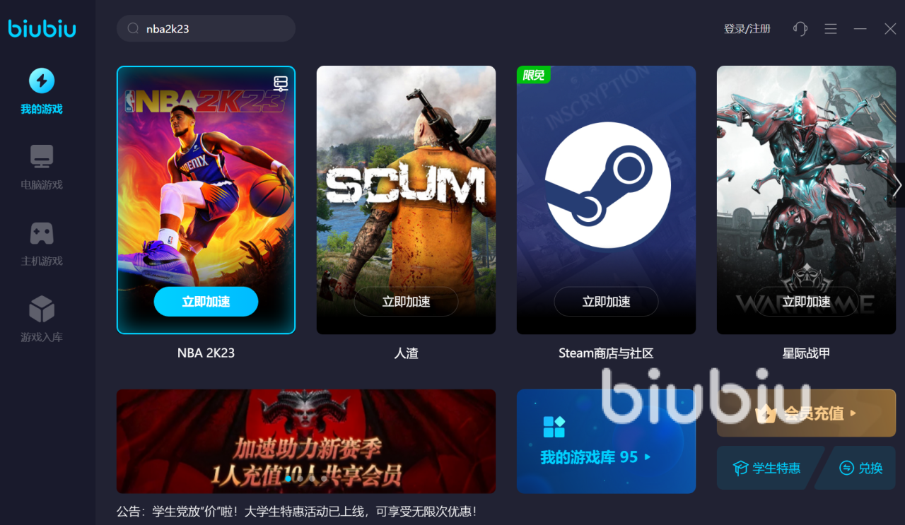 2023年07月25日 15:22 来源:魔法多嘟嘟利1nba2k23闪退怎么办?这是一款非常经典的篮球类型游戏,整个系列都非常的受欢迎,不过近来很多人反应在游戏的时候总是遇到闪退,画面卡顿或者是掉线的问题,遇到这样的问题很有可能是因为网络信号不好导致的,所以大家可以选择一款好用的加速器来搭配使用,接下来给你们分享下自己一直在用的biubiu加速器,喜欢的话跟着一起看过来吧。