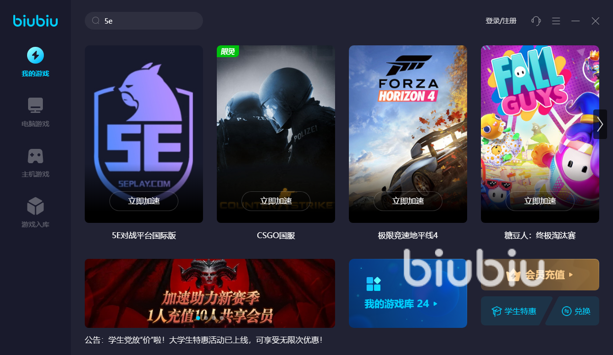 众所周知,biubiu是给游戏加速的,不过像5e这样的平台也是有的,而且使用这个平台加速给它的玩家还不少。也许使用5e的玩家比较多,所以就会出现卡顿掉帧,这也是需要用加速器的原因之一。而且现在新人玩家登录biubiu还有72小时的会员用,惊喜简直是一波接一波。