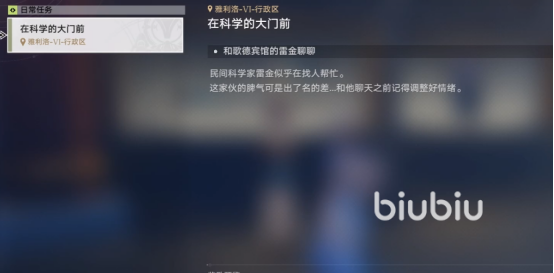 首先,我们要了解“在科学的大门前”这个任务是一个连续的日常任务,需要将所有小任务全部都完成才行。当我们接取了任务后,需要先传去贝洛伯格行政区域,然后马不停蹄地赶往歌德大宾馆,上到二楼,和站在左边的雷金进行对话。