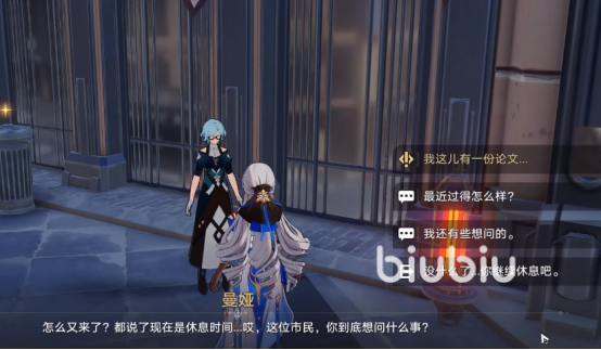 他会告诉我们需要替他把论文结果交给曼娅,当接受这个任务请求后,就可以从大宾馆出来,往左侧跑,一直跑到机械屋,然后右转,就会找到她。这样第一天的任务就完成了。之后等到第二天,我们还是来找这个性格古怪的NPC,他表示让我们去找曼娅做题目。