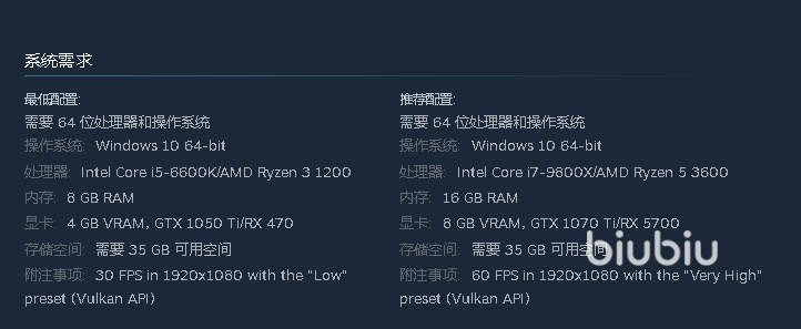 本作仅仅兼容Windows10以上的系统,并且对于显存要求是保底要有4GB,最低需求型号是GTX1050Ti。若是想高画质运行得换成GTX1070Ti以上,而显存要求也变成了8GB。内存的话就不用多聊了,基本不是8GB就是16GB如今新电脑都是这两种规格,再低的话玩起来卡的不行。处理器需要至少六代i5,若你想把画面打高得换9代i7。存储空间虽然写是35个G,但为了防止以后更新或者出dlc什么的还是多留一点好。