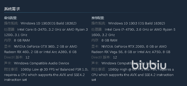 目前官方已经将建议的配置参数公布了,详细内容你可以对照插图看一看。总体来说也谈不上多高的要求,毕竟如今40系显卡都很普遍了,这里最低给到的型号还是淘汰已久的GTX960,内存的话无论是高配还是最低都仅需要8GB,也算是对于很多老机器的“喜讯”。处理器方面也是和别家的要求差不多,唯一遗憾的是没把硬盘占用标出来,不过按照目前的趋势是个3A都要100G以上,你还是需要多预留点空间。