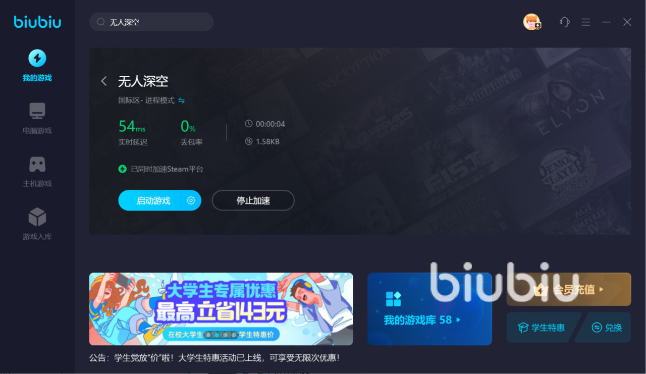 无人深空这款游戏要想获得最佳的体验最好还是以PS或者switch去进行游玩,因为鼠标和键盘控制的方向感还是稍微有些差,用这两个外设去进行主机游戏会有更强的参与感,当体感融入到这种极致画面的游戏之后就会给你带来全新的体验,要想找到主机端的入口也是同样的搜索模式,而且现阶段biubiu在加速主机类游戏时都是限免的。