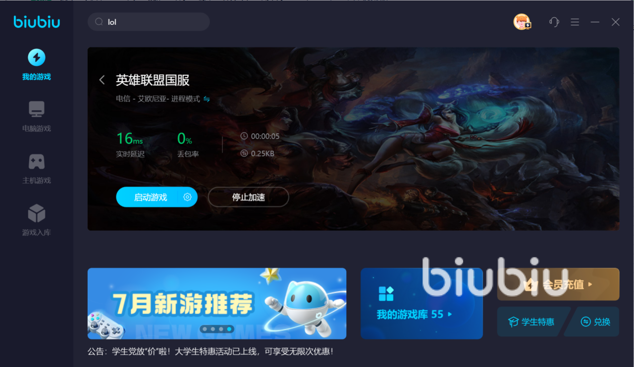 lol作为拥有国服的游戏在biubiu内当然也是好处多多,现在biubiu有一个活动就是专门针对国服的,凡是能在资源库中搜索到的国服游戏均可限时免费加速,所以像是普遍腾讯系的游戏其实在biubiu加速现在都是不花钱的,不过限时活动大家还是要好好把握,如果想加速国服以外的服务器也不必担心,因为biubiu在面向新用户首次注册时也是直接赠送三天的加速体验,这个加速体验就包含了外服的游戏在内。