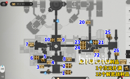 那么太卜司宝箱在游戏里面的何处呢?它们的数量总共有26个,其中15个解密宝箱、10个普通宝箱、1只次元扑满,虽然听起来数量确实比较多,但是还是比较容易找的,具体位置如下图所示,只要根据图片来找的话,问题不大。