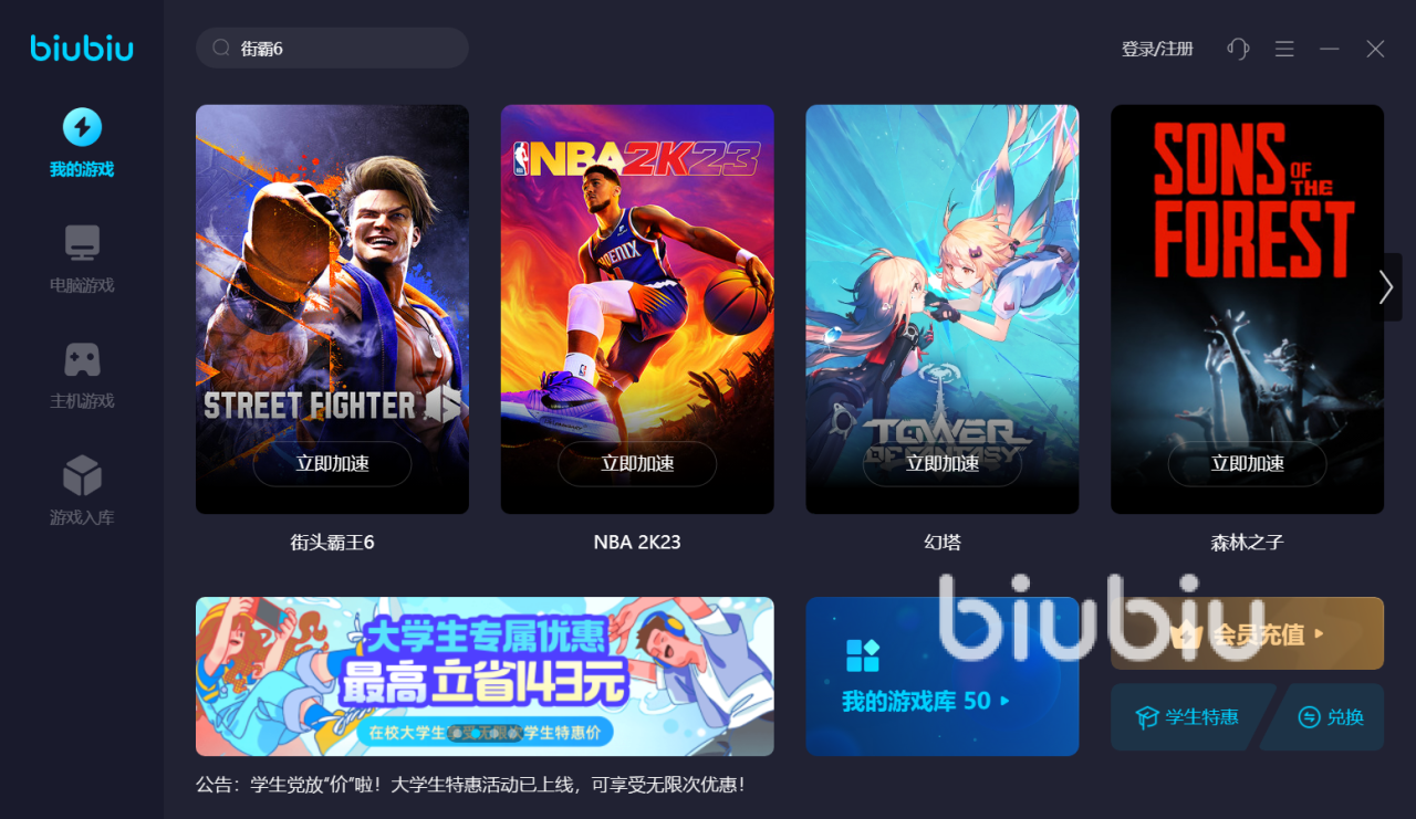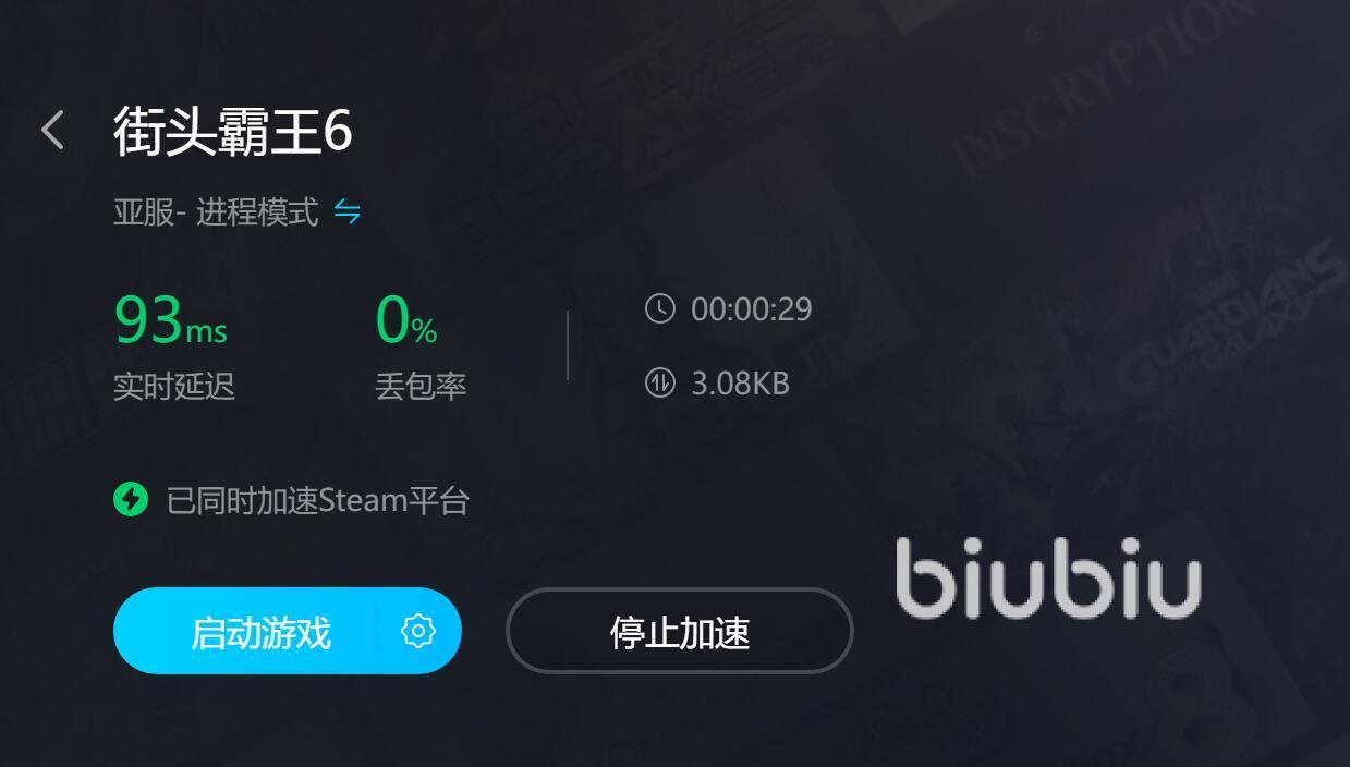然后,一键开启加速。在软件上方搜索栏中输入街霸6,找到相应的版本、服务器专区,打开加速。biubiu支持一键加速和停止加速,用户只需要简单三个步骤,智能设定加速。
