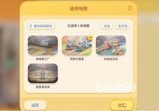 首先,我们在创建房间的时候,可以进行地图的选择。点击想要体验的地图勾选后,再点击右下角的创建,就可以进入房间,然后邀请自己的好友或者添加机器人一起游戏了。