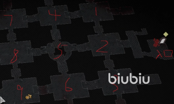 首先将客厅划分为1-9号房间,我们来到第八号房间也就是棋盘室。下棋的规则很简单,如果黑色棋子连成一条线则判定我方输,这个时候我们的角色会受到一层诅咒。如果白色棋子连成一条线则我们赢,可以获得武器皇家猎弓。