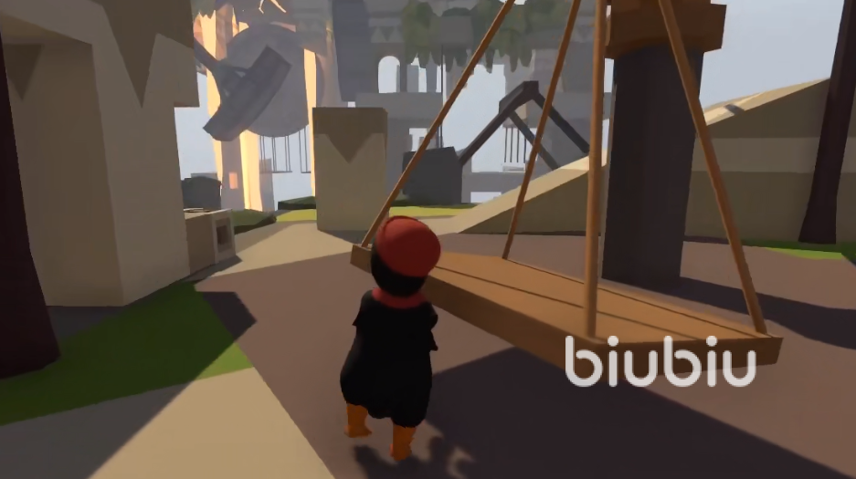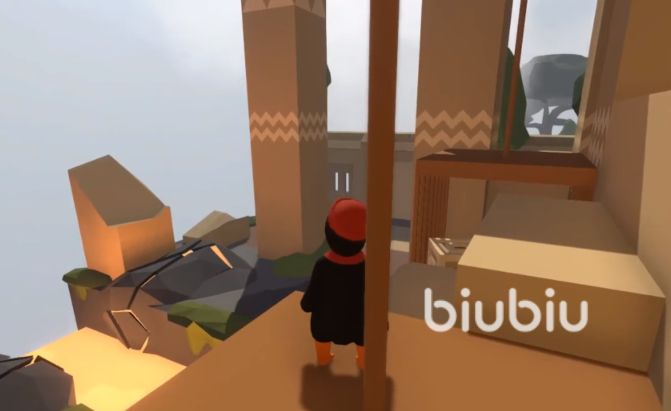利用木块当做垫子爬上去高台就可以换个地方了,在这里有个木板,用它向前走然后跳向下个平台处。看到这里有个木块,把卡在里面的木块拿下来放到跷跷板的内侧,这样就可以从高的那边跳上去了。后面有一段平路,走到尽头可以发现有个吊板在石台上面,跳上去之后就可以利用前面吊着的木块爬上去另外一侧的台子。
