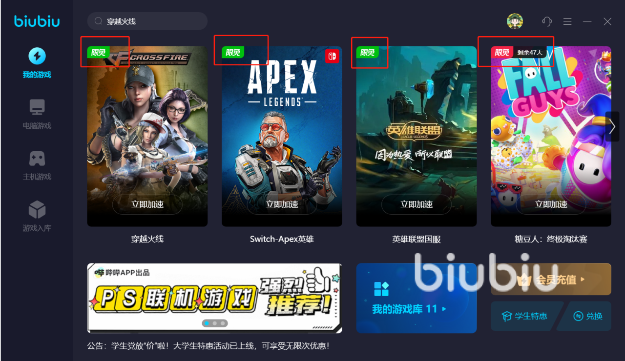 刚在说过了,cf一类的国服游戏都是限免的,大家可以在游戏的左上角看到是否标注限免来判断。更多活动可能在主页上会进行依次的展示,最下方通常是一些游戏的推荐和新游的预告等,右下角的板块是充值内容,首充优惠以及学生优惠,适合那些常玩游戏有需要的小伙伴。第一次使用的话,还有新用户注册免费使用加速3天的活动,走过路过的不要错过了。
