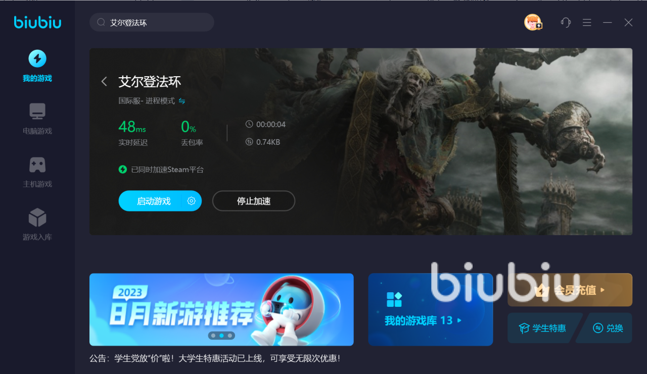 因为这款游戏的“肝”性确实比较严重,一般人初次在面对这种游戏的时候难免会受不了,所以总会玩一会再去换别的游戏,此前的话有些人可能会担心浪费加速时长和次数,不过biubiu只要是得到加速会员之后就不限次数和不限时间,想开启加速和关闭加速都是点击同一个地方即可,同样对想玩的作品也都是相同的搜索模式,要是大家就想先短暂的去适应一些艾尔登法环的节奏模式,也没有打算长期去玩的话,正好可以借着biubiu新用户注册领取三天免费加速的机会去打一打看一看,反正对于没开加速器的人来说是有很大的优势。