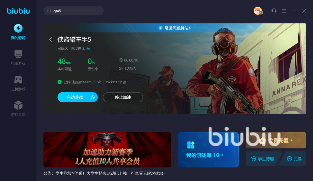 因为gta系列游戏就是相当注重游戏个人体验的,要是前期阶段就想跑跑剧情的话在单机模式下是不用加速器的,但大家想要启动游戏还是得先有个Steam并能正常打开,所以不管是进行到哪一步都得去搭配到加速器,尤其是当一大战局里面人数增多之后对网络要求会越来越高,像是高延迟导致的掉线和掉帧问题就出现了,而这个时候要想一次性解决游戏的启动和联网问题的话就用biubiu加速器。