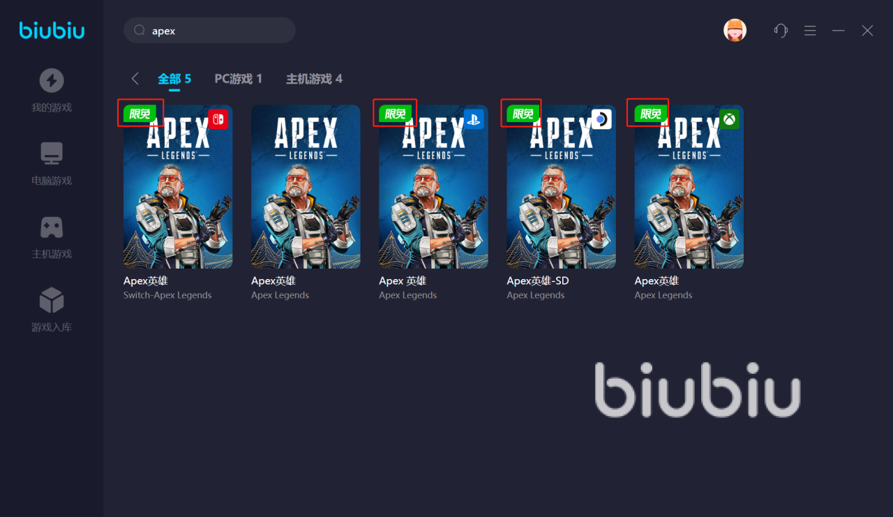 大家看到这里应该对biubiu都会有一个不错的印象,但没用过的玩家肯定还会存疑一个点,那就是自己玩的apex不是pc端而是ps或是Switch的话怎么办?或者说自己购买的渠道也是一些渠道服,在biubiu里可加速的通道可不仅限于pc,能看到除了pc之外剩余的四个端口左上角还都标着“限免”,这也是biubiu长期开展的一个活动,你要是想用先进的ps和Switch来体验的话是不用花钱的。