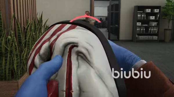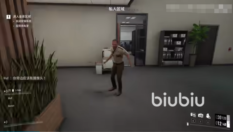 进去后直接向右边进入SCB私人区域,打开大门后向右走,然后按F键打开左手边棕色的门。进去后直接向前将磁锁的开关关掉,然后再回到门口的架子处激活诱饵。这样警卫会直接被诱饵吸引过去,我们躲过警卫关掉另外一边的磁锁开关。这里不慎警卫发现了,那就直接带上面具击杀掉他,然后再抓一个工作人员挟持他直接向外走。