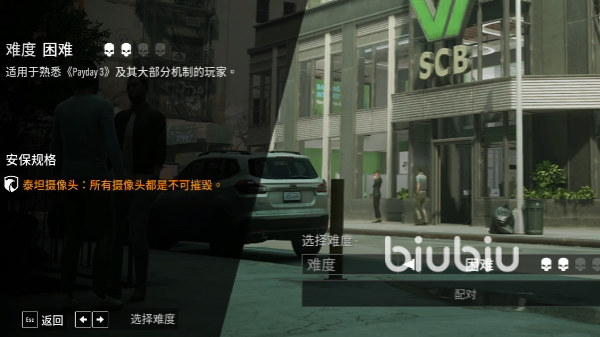 首先进入游戏我们有四个难度可以选择,按自己的需求选择好难度后就可以进行匹配玩家。总共可以匹配到三个玩家,如果在线匹配不到人的话,那么系统会自动给我们安排三个电脑玩家一起进入游戏。进入第一关的主要要求便是让我们抢劫银行,首先要操纵人物进入银行。