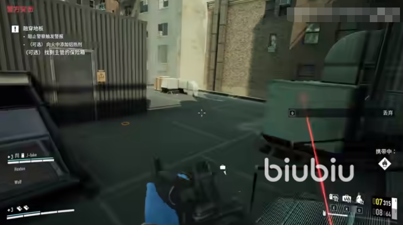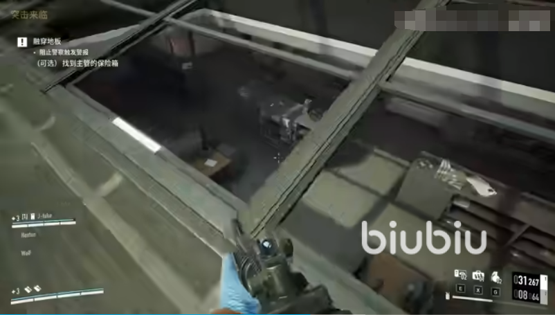 等关闭了安保系统之后,会提示我们到外面等待空投,在这期间我们可以重新进入银行补充弹药和护甲。当外面的铝热剂被直升机投下时,我们在外面停车场找到一个像公事包的白色标志,那里就是铝热剂的位置。拿到物品后将它放到二楼的泛着金光的位置,然后按F键点燃,这个时候就会开始融穿地板了。