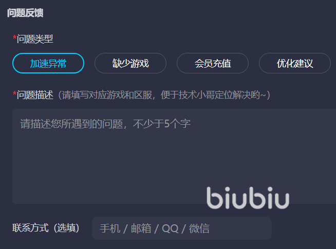 小编体验biubiu加速器的时候基本上没有遇到什么问题,当然了,不排除小伙伴有不懂的或者加速异常的情况。交给大家一个好办法,平台的问题反馈窗口就要好好利用起来,到时候要针对到游戏,加速时选择的服务器、区服等等细节,介绍清楚了解决起来才会更快。售前售后都是可以咨询一下的。平台本身的话还有着一些信息资讯,到时候主页查看,那些新用户注册免费使用加速3天的小伙伴可以利用好这三天开心游戏哦。