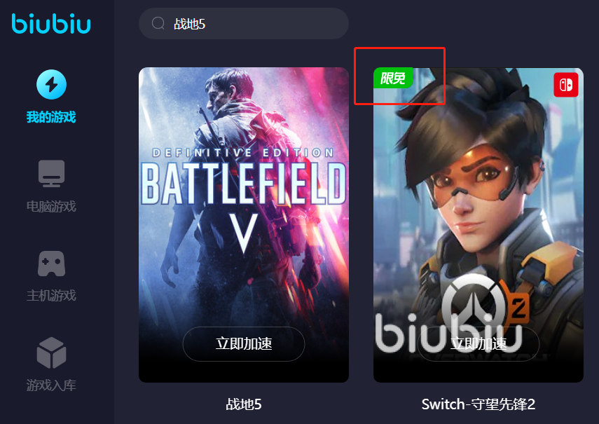 有时候大家玩战地五的时候,还会考虑其他战地系列游戏,biubiu加速器同样满足的。游戏内容是非常多的,现在平台的游戏板块分为了几个大部分。像国服游戏、热门游戏和主机游戏这些,大家可以自由选择喜欢的游戏开启加速,对于没有找到的游戏则向biu仔进行反馈。有新用户注册免费使用加速3天和其他限时免费加速的游戏等,更多内容的话到时候平台主页上也会给大家展示到位。
