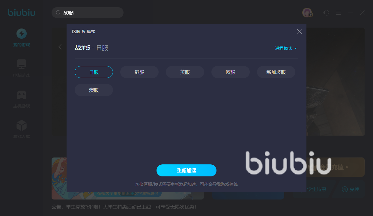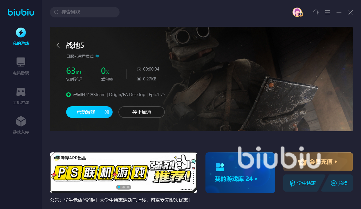 战地5还容易出现的就是游戏内的延迟问题,大家会发现明明自己已经投掷了反坦克手雷,或者已经打到了面前的敌人,但是游戏画面总是会卡顿,甚至会出现“时空回溯”的情况,这很有可能和大家选择的游戏平台有关系,游戏平台对网络的波动影响了大家的游戏进程,而biubiu加速器可以根据不同平台有针对性地进行加速,不仅人性化,而且专业化。
