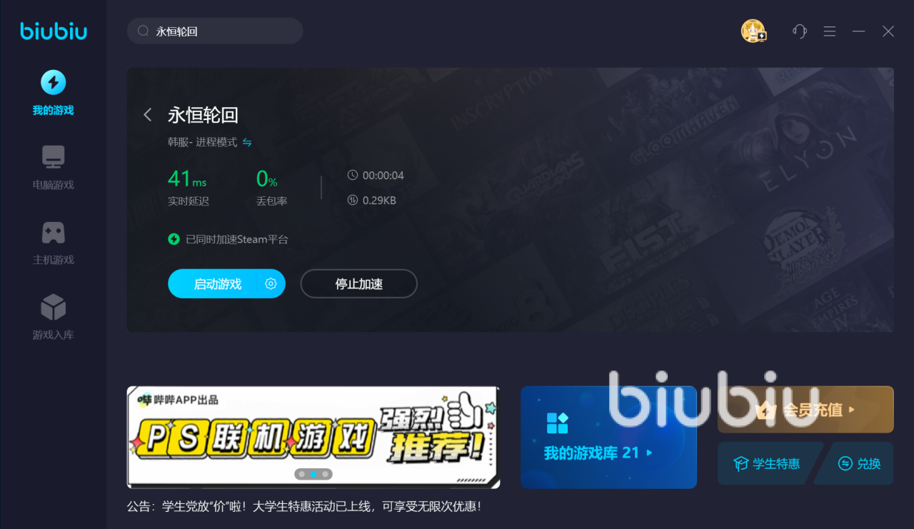 以上就是永恒轮回闪退用什么加速器好全部内容,要是平时就对竞技类游戏很感兴趣的话,那么永恒轮回的模式和一个题材应该就是你所喜欢的,同时也还是那句话,虽然biubiu不能让你的水平直线上升,可游戏感受要强很多。