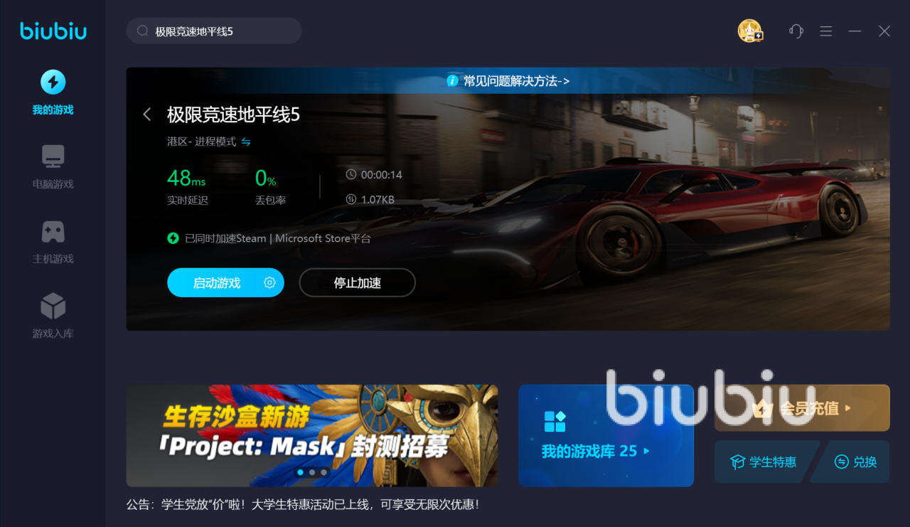 因为极限竞速地平线5本身的游戏服务器是建立在全球的各个城市之外,就是排除了国外在内的服务器,所以它就是个特别标准的海外游戏,还是在微软跟Steam直接去售卖的,你要是不走这两个海外平台的话连进行游戏的资格都没有,就算是有办法也将面临上百的高延迟,不过再高的延迟也能通过biubiu的加速得到降低,那么究竟表现如何大家可直接在首页的展示里自行查看,要实在担心延迟效果的话,也是能通过新用户的首次注册领取三天体验来化解的。