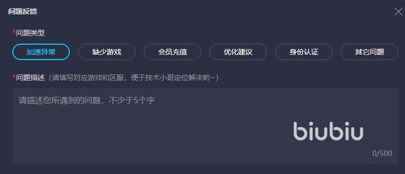 Biubiu除了加速效果好之外,也是很注重用户的反馈。哪怕你是新用户,在3天免费使用加速期间遇到加速效果不好的情况也能在“反馈”板块上进行问题的反馈,如果用户反映的问题确实会影响到用户的体验那么平台会做出调整,让用户享受更好的加速效果。如果想要加速的游戏不在软件的游戏库内也是通过这个渠道进行反馈,如果这个游戏确认热门或者是新上线的热门游戏,平台也会积极引进这个游戏。