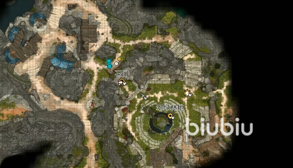 首先我们先要到达翠绿林地这个位置,传送到这里后需要一直走到叫做石门的地方。我们会在石门的附近找到一个叫艾隆的商人,在商人的左边不远处有一只黄色的牛。