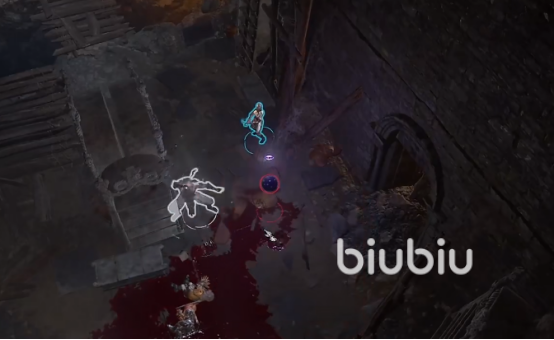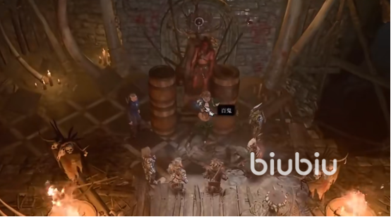 我们前往座狼兽栏上方一点的位置,从地精营地营救德鲁伊之后,他要我们帮他干掉三个地精头目。我们直接从地牢的正门出去,出来后就会直接触发战斗,这里守卫会过来敲战鼓,我们要先将他手里的战鼓摧毁。战斗的过程中,怪物眼球会一直叫自己的小弟过来支援,我们需要德鲁伊变成人形态,用雷鸣波给它打掉。因为眼球怪有伤害抗性,只能使用雷点属性的技能才能对它造成伤害。