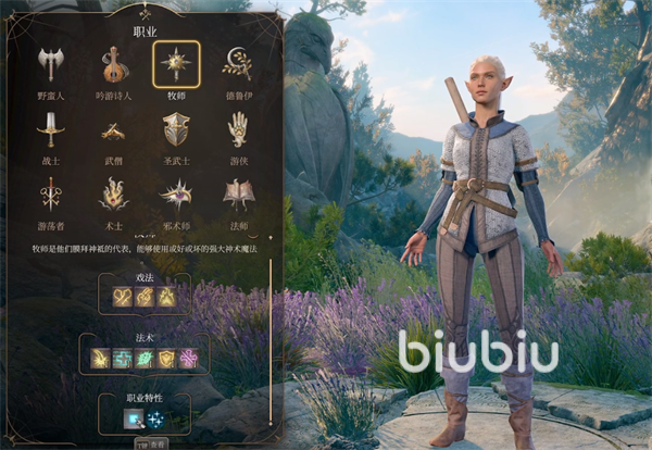 牧师是属性基于智慧的施法型职业,其力量因神而异。德鲁伊是属性基于智慧的施法型职业,能够进行变形并且加持增益状态。