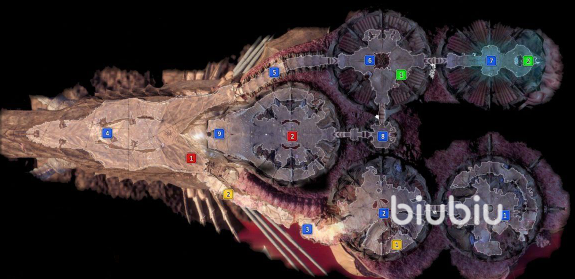 故事一开始,视角就拉到了螺壳舰,这里的恶魔有着巨大的阴谋,主角为了活命,必须要尽力逃离此处。为了让大家看的更清楚,小编已经将有意义的点位都标注出来了,并且按照颜色分类了。