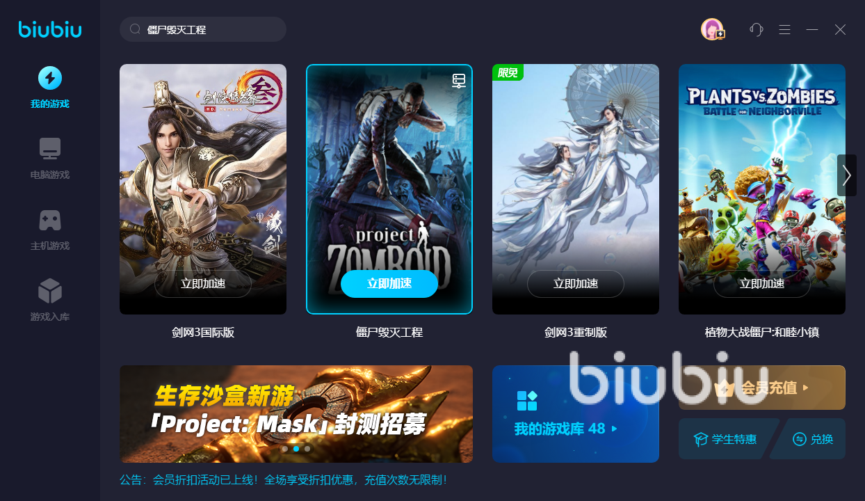 biubiu目前只要是新用户,上线即送三天的免费加速时长,限时活动先到先得,并且针对steam的游戏、暴雪的游戏还有咱们国服自己的游戏,都有限时免费加速的活动,能让大家体验到biubiu加速器的性能有多强,而且biubiu能加速的游戏也有很多,不怕大家找不到自己需要加速的游戏。