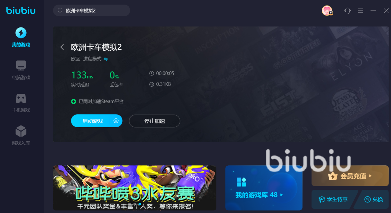 2023年08月14日 17:41 来源:小鹿不猴怪1如果你是一名卡车爱好者,那么欧洲卡车模拟二就是一款非常适合你的游戏。有小伙伴问小编,欧洲卡车模拟2网游加速推荐哪个?在这个游戏中玩家可以驾驶卡车运输一些东西来完成相应的任务,在游戏中不仅可以开卡车,也能去购买各种的卡车和车库,然后雇佣一些司机为我们工作,甚至构建一个庞大的物流帝国。biubiu加速器是一款十分好用的加速器,接下来小编为大家介绍一下该加速器的优点。