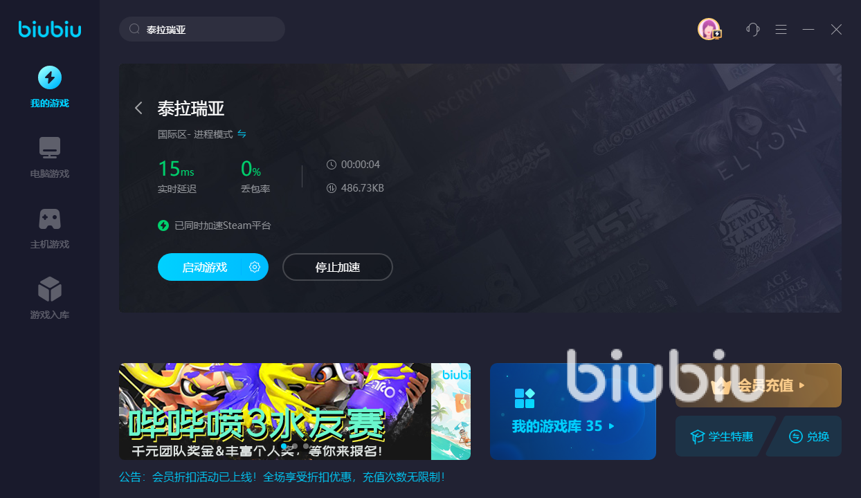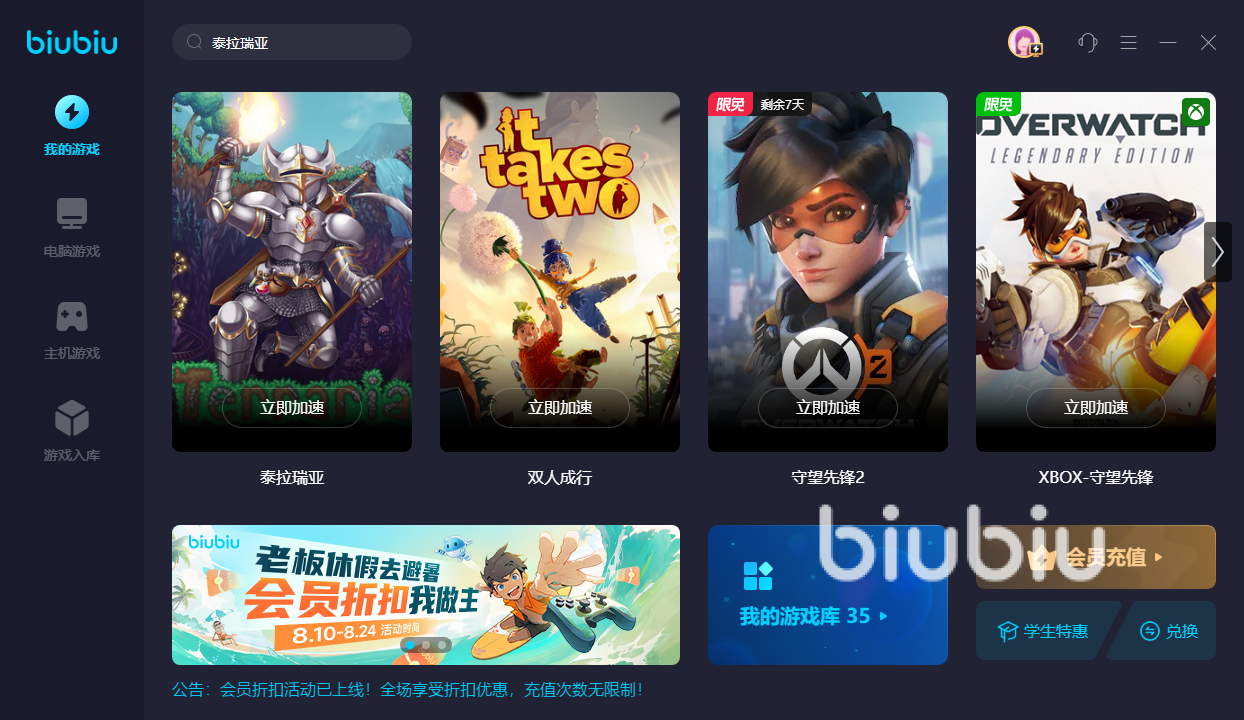 很多泰拉瑞亚玩家都是在steam端进行游戏的,而目前biubiu加速器对steam端的游戏是限时免费加速的,就算大家没有购买也可以享受到极致的加速服务,同时新用户只要是第一次登录biubiu加速器,就会直接送给大家三天的免费加速时间,这三天里无论加速什么游戏,只要是biubiu游戏库里有的都是免费的,非常超值,是不是很心动呢?