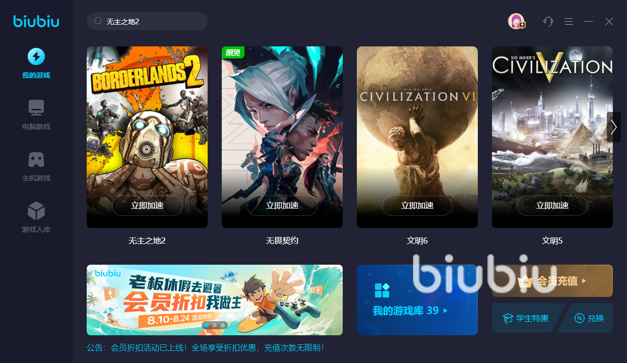 无主之地2在PC端是在steam里购买和游玩的,而biubiu加速器目前正好可以限时免费加速steam里的游戏,新用户更是畅享三天免费加速,还有国服游戏也是限时免费加速的,这基本囊括了很多玩家日常游玩的游戏,可以让大家体验感提升的同时还不用花钱,福利和诚意直接拉满了有木有。