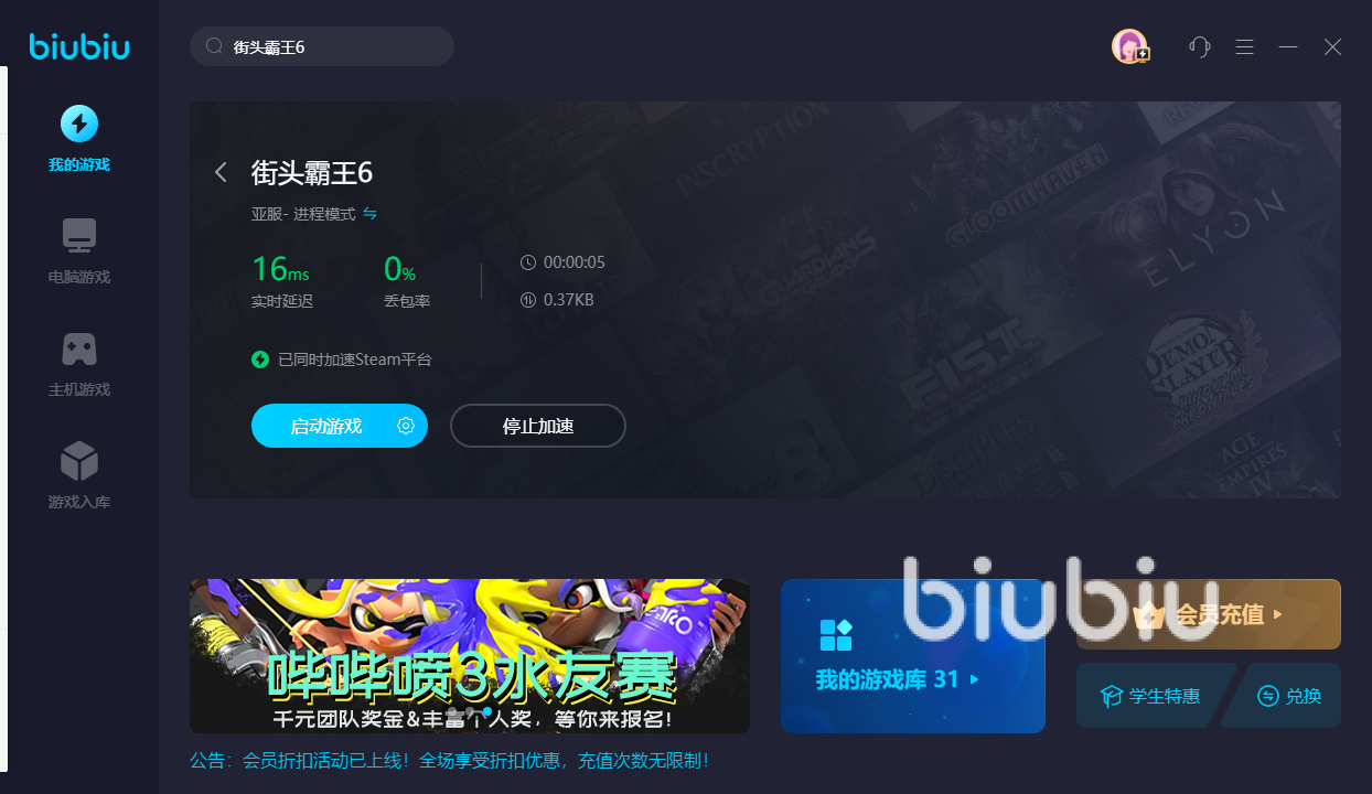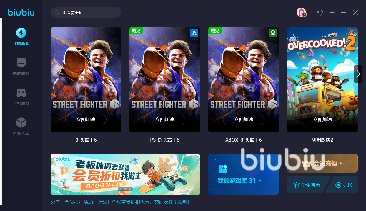 2023年08月14日 17:37 来源:野兽己孙悟空街头霸王6是街头霸王系列新作,就是各位格斗游戏爱好者口中的街霸6,在传承了前几代优点的同时,又再一次进行了优化和更新,在格斗游戏爱好者圈子里颇具盛名,而这款游戏是需要加速的,加速街头霸王6什么加速器好就是喜欢这款游戏的朋友们想知道的,下面小编就给大家推荐这款加速界的新秀,老炮游戏爱好者们的宠儿——biubiu加速器!一个你无法拒绝的加速神器!
