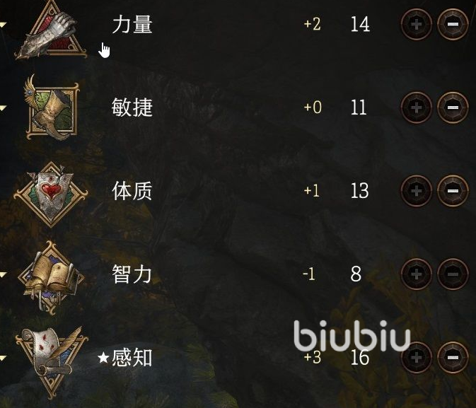 这个职业很多招数伤害直接和敏捷挂钩,所以这是优先级最高的选择,不然战斗时候刮痧就很难受了,另外感知会影响游侠的施法判定,最后需要加一点体质保证自己的血量最大上限,否则攻高皮脆一被近身就倒地会很麻烦。