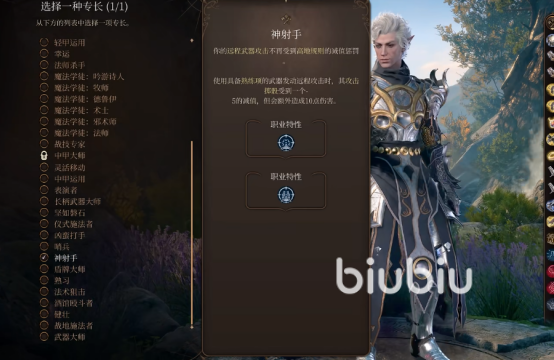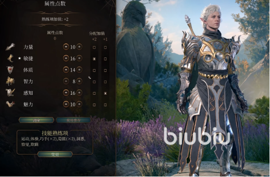 其次,我们来看属性点,力量10,敏捷16,体质14,智力8,感知16,魅力10。主要保证敏捷值高。前期在8级的时候需要做一下更改,前三级就按照正常点,等到4级将神射手专长点出来,适合前期开荒使用。等到4级点1级游侠,选择游侠骑士可以穿重甲,点城市追踪者,可以加巧手熟练项。2级游侠点出箭术。副职选猎人,点出巨像屠夫。之后点战斗大师,点出防御,选择冠军战。