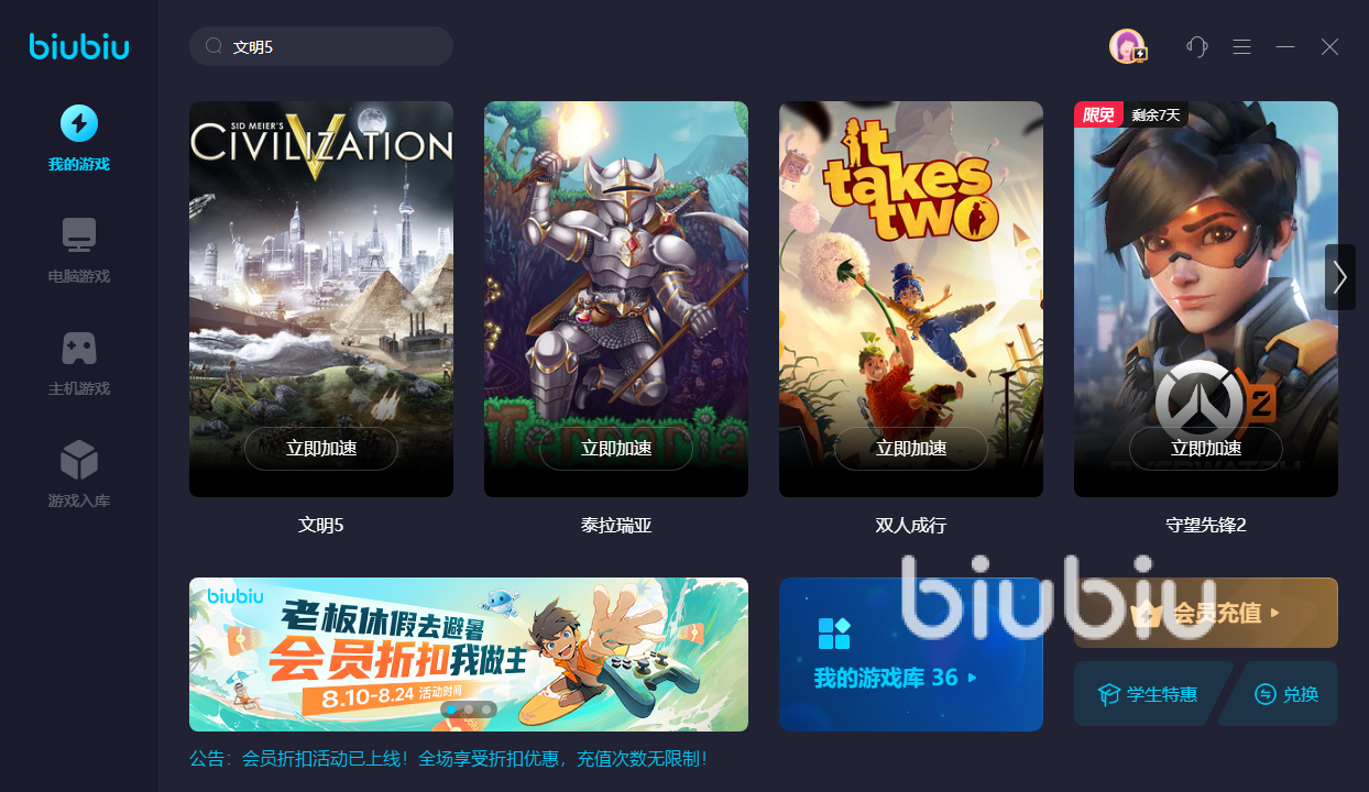 文明5目前在很多平台都可以玩到,而steam端的文明5目前在biubiu加速器里可以享受限时免费加速服务,并且如果大家之前从来没有用过的话,只要注册并登录biubiu加速器,就可以作为新用户直接领取到三天的免费加速时长,绝对让大家玩的开心,玩的痛快!
