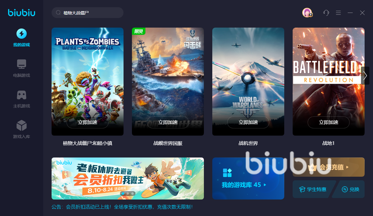 2023年08月16日 16:10 来源:魔法多嘟嘟利1植物大战僵尸是一款经典的塔防策略游戏,也是很多塔防迷特别喜爱的游戏,而且这款游戏目前也有很多新的僵尸和新的玩法出现,让大家玩的非常上头,而有些朋友运行它的时候会有些不流畅,加速植物大战僵尸什么加速器好就是很多想要享受最佳游戏体验的玩家们想知道的,下面小编就给大家推荐一下这款能帮助大家爽玩植物大战僵尸的加速器——biubiu加速器,让豌豆射手再发神威!