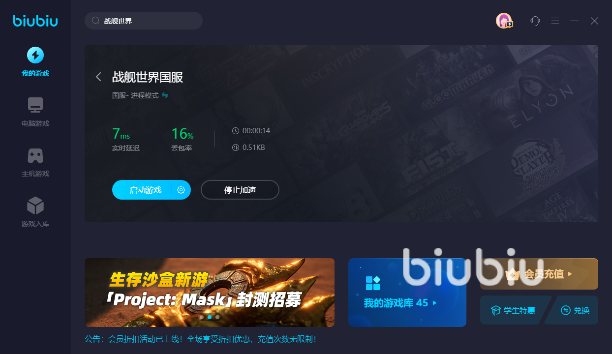 2023年08月16日 16:07 来源:狼骑和椰蛋树5战舰世界是一款喜欢海战和战舰的朋友们非常喜欢的一款游戏,在该游戏里,大家能驱使着自己喜欢的战舰在一望无垠的大海上与敌方海军进行紧张刺激的搏斗,这款游戏有加速器的帮助会更好一些,加速战舰世界什么加速器好就是想在游戏里有更多流畅体验,打出更高伤害的朋友们想知道的,biubiu加速器就非常适合大家,能让战舰迸发出更加强大的力量,还等什么,快点来感受一下吧!