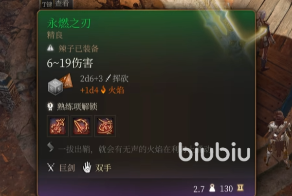 比如在游戏开局就出现的一把神器永燃之刃,它攻击上限高达19,攻击时还附带火焰效果。这把武器可以说是战士和野蛮人在游戏前期必拿的,纵使我们角色不是这两个职业,也可以将武器交给莱埃泽尔使用。而这把武器获得的方法就需要用到牧师的命令术这个技能。