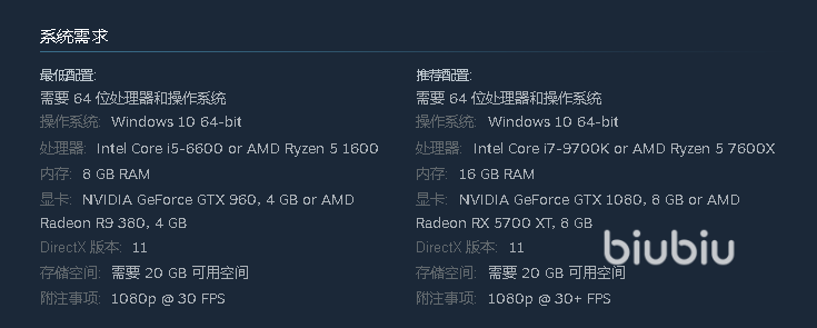 由于是虚幻4引擎制作,所以对于硬件方面也有些门槛,但也不是太高,低配环境下显卡需要GTX960,现在是40系时代末期大家的型号大部分应该都比这先进,六代i5以及20GB的存储空间放现在看也算不了什么,不过要注意最好将其安装到固态硬盘上,不然加载读条将会很慢,而系统的话需要windows10代以上。