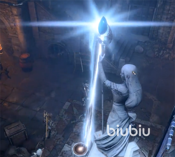 当玩家通过木爬梯进入哨站后,就可以看到一座塞伦涅雕像。雕像手中高举着一个法杖,法杖顶端有着一颗月长石散发着光芒,这颗月长石就是探知之眼,解密探知之眼后才可以解锁后续的道路。