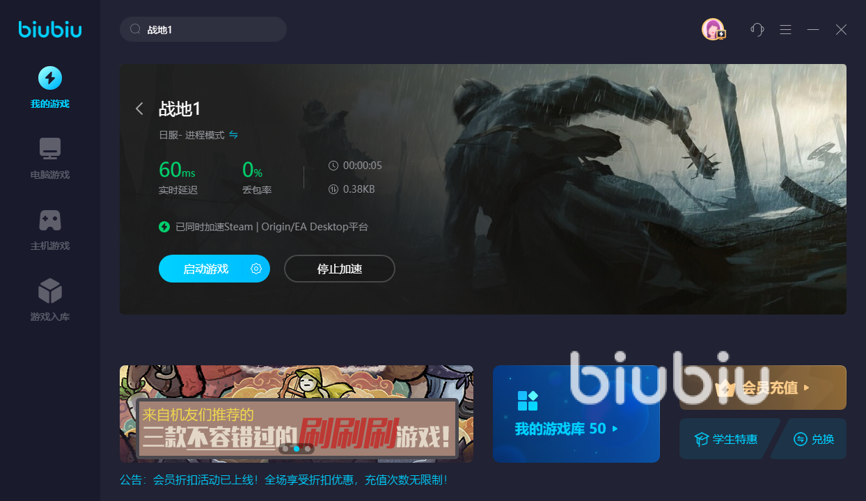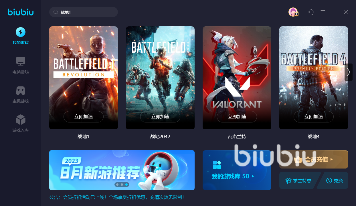 biubiu现在针对PC端游戏还有很多的优惠福利,首先就是新用户,注册登录以后就有三天的免费加速时间可以使用,其次是只要大家玩的游戏是国服的,现在都有限时免费的加速可以享用,玩LOL、无畏契约等游戏的朋友们有福了。还有steam和暴雪平台的游戏用户,目前同样可以享受到限时免费加速的福利。
