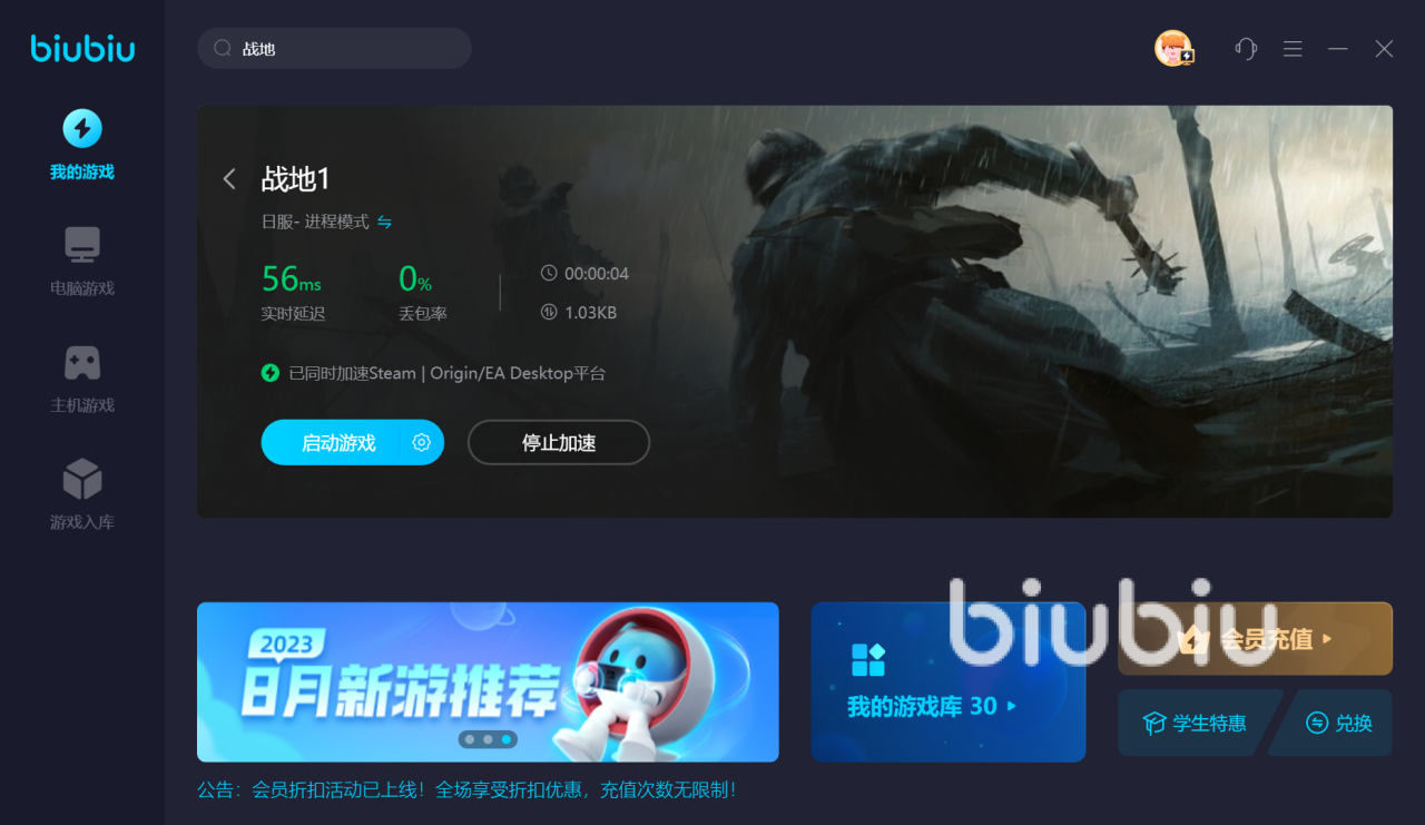 在开启biubiu后就不用去操心其他的事了,只要花费几秒钟的时间先以新用户注册的身份领取三天免费加速,然后找到你要玩的战地系列版本点加速就好了,只要出现了正在加速和数据字样之后就可以安心地缩小至后台了,就算运行的时间再久也不会发生掉线的情况,因为biubiu线路性能卓越游戏是在稳定性上有着很出色的表现。