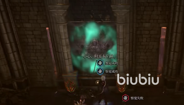 进入暗门之后,往前走会发现一个泛着紫光的大圆盘,在圆盘的顶端放着一颗穿越宝石。我们直接操纵主角去触碰这个宝石,便可以直接传送到莎尔的试炼场。进到的第一个房间机制很简单,需要将几个小隔间的控制杆拉起来,让所有的灯都降下来,然后依次将它们熄灭,以此来显示出中央的法阵。这里需要注意的是,在拉杆前每个地方都会有一个陷阱,需要我们通过掷骰的方式来拆除它,否则当踩到陷阱的时候就会爆出来一团黑雾。等法阵显现出来后,我们触碰中间的机关就能打开大门。