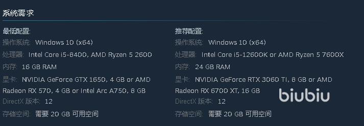 本作因为是抢先体验版,内容还不太完整,所以存储空间占用只有20GB,但这仍需要你放在固态硬盘当中,否则转速太低会导致你在加载地图时频繁读条。对于内存方面需要最低16GB,而高配更是达到了24个G,毕竟该作的NPC比较多,并且他们都不是站桩的,有很高的自主性,所以在内存这方面有比较高的需求。