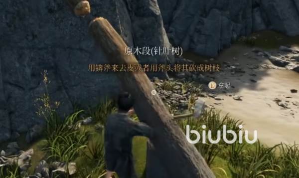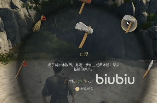 首先我们需要在沙滩上采集一些树枝和石头,接着打开制作菜单做一把斧头。然后需要用这个工具来砍倒木头,并且进一步加工成原木段。