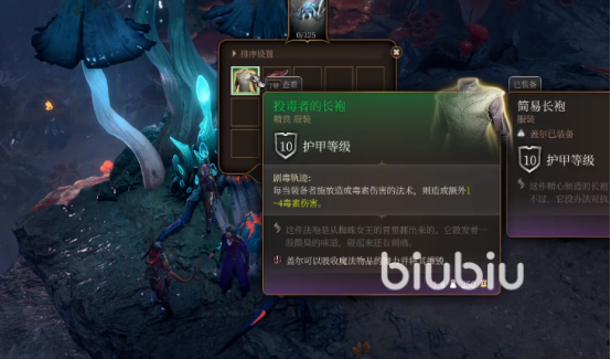 我们在将它解决后,可以点击它的尸体,它会给我们两个道具,一个是精良的投毒者长袍,可以造成额外的毒属性伤害。这个既可以给法师穿戴,也可以喂给盖尔提升他的属性。另一个是蜘蛛丝腺,可以用作制作蛛网爆弹。
