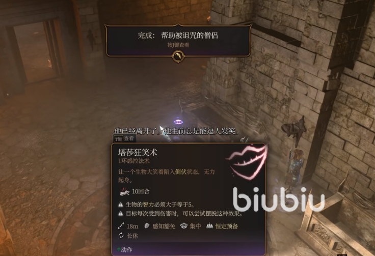 原来这个NPC是因为收到了狂笑术的诅咒,如果玩家愿意帮他承担这个术法,他就可以解脱了。博德之门3被诅咒的僧侣完成方式说完了,接到了这个任务却不知道如何完成的小伙伴,现在就可以进行后续的步骤了。越往后期,会有更多好玩有趣的玩法出现,大家好好体验吧。